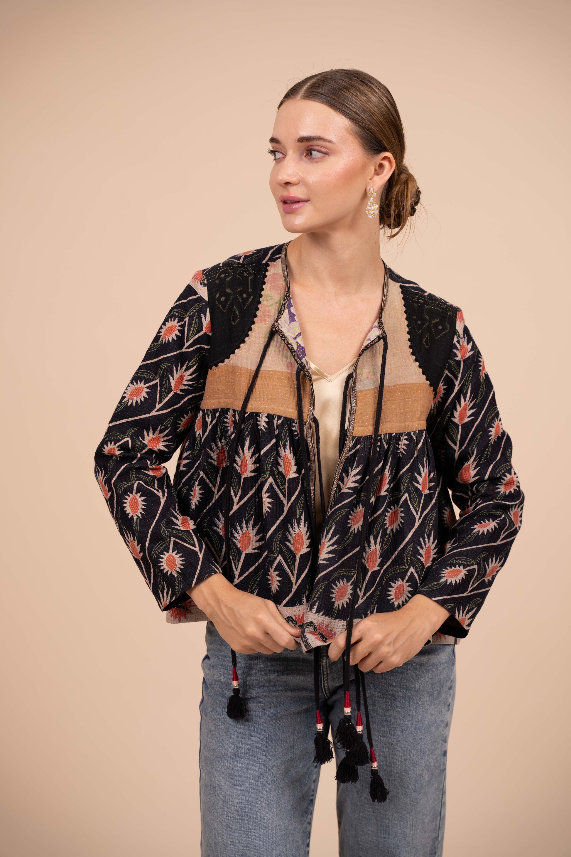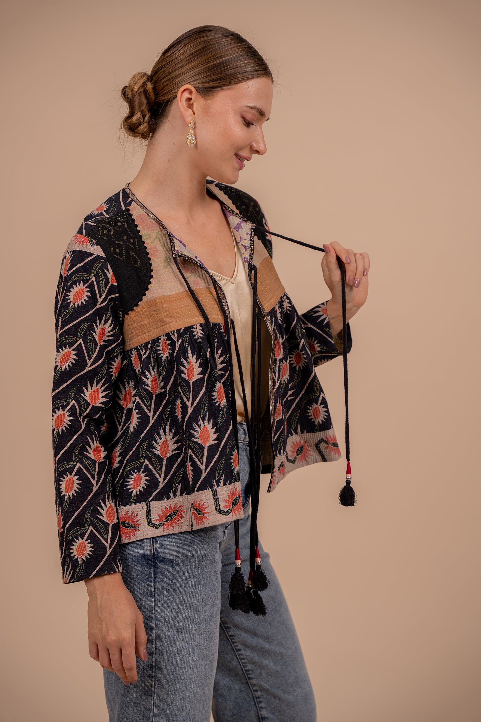 Cropped and flared, made from vintage kantha quilts fabric, each piece is one of a kind. Hand Embroidered and patch worked to add details.