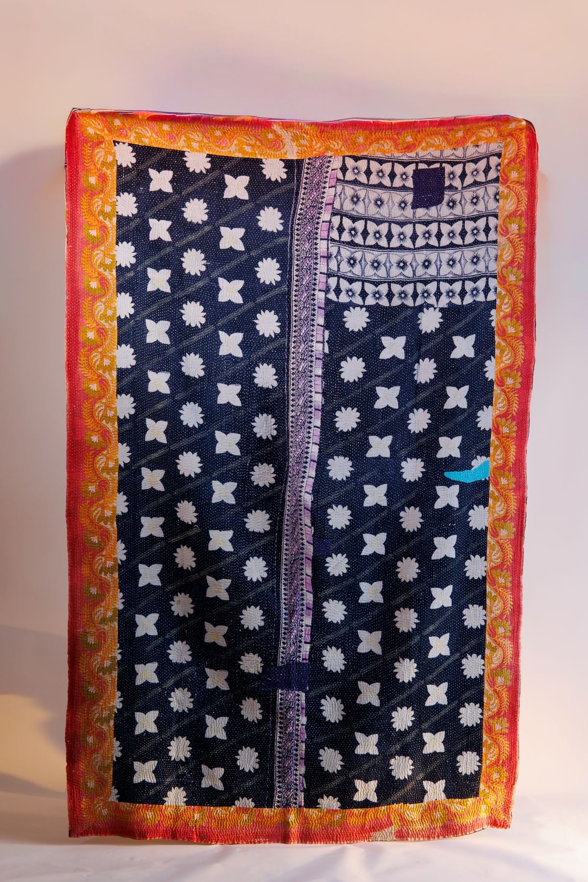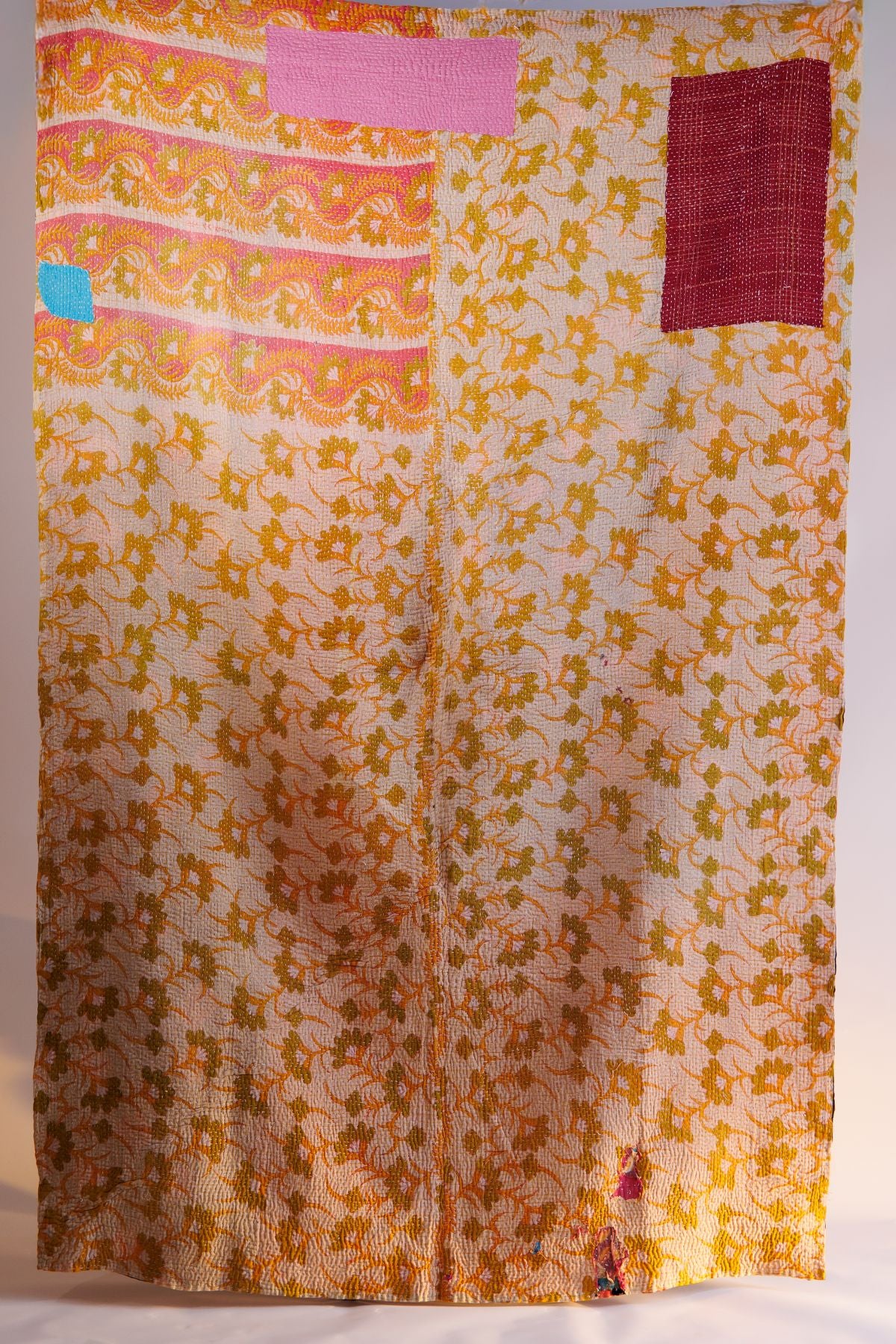 Most kantha quilts can be machine washed in cold water and air-dried. However, due to their vintage nature and hand-stitched details, we recommend dry cleaning for optimal care.